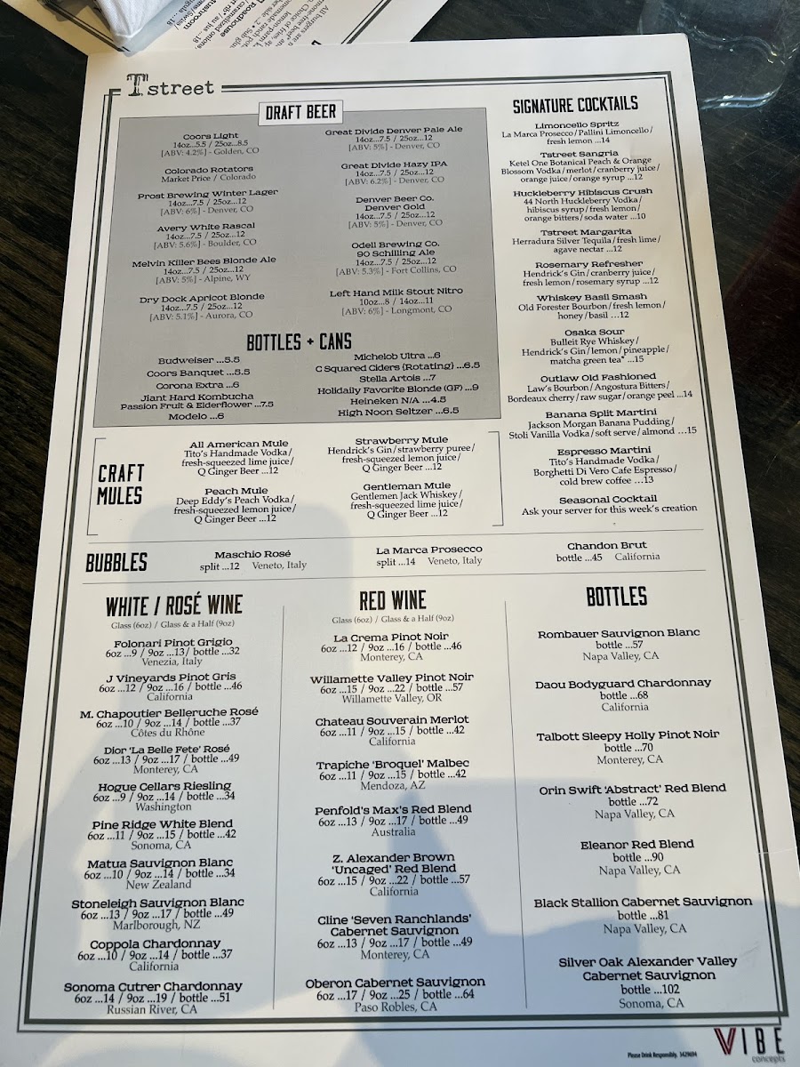 “ Moved away in retirement a few years ago, after a lifetime in the mountains. Coming back home is full of discovery. We had never eaten at Tstreet before. Asked our youngest grandchild what's their favorite restaurant, so we could go celebrate their 15th birthday with family and friends, and the immediate answer was Tstreet. Absolutely loved it, from the appetizers (nachos garnished with paper thin radishes! & Thai cauliflower), the salads (3 of us had one, all different, all impressive), to the prime dip, shrimp linguine and fish tacos. Everyone (including the chef in the family, who had eaten there a few times) reported excellent food. In fact my husband said it was the best dip sandwich he's ever had in his life. Nice atmosphere. It was great, we'd love to return. ”